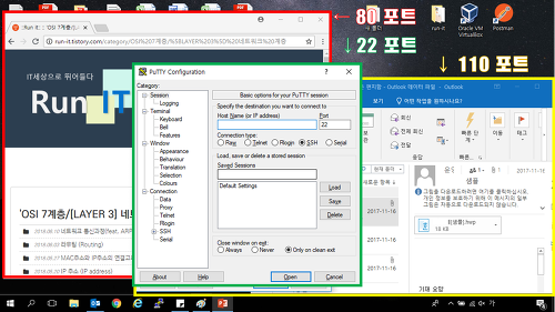 웹 브라우저로 서버에 접속을 하면 서버의 80번 포트를 가진 프로그램에 접속합니다. 메일을 확인하기 위해 메일 서버에 접속하기 위해서는 110번 포트를 사용합니다. 그리고 특정 프로그램에 SSH 접속을 할 경우에는 22번 포트를 사용한답니다!