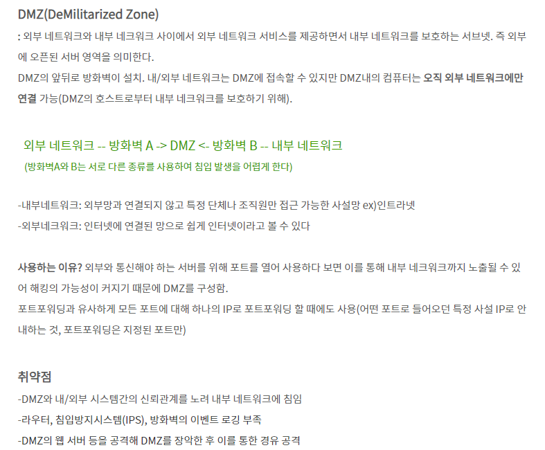 내부 네트워크에 존재하지만 외부에서 접근할 수 있는 특수한 네트워크 영역을 DMZ라고 한다.
