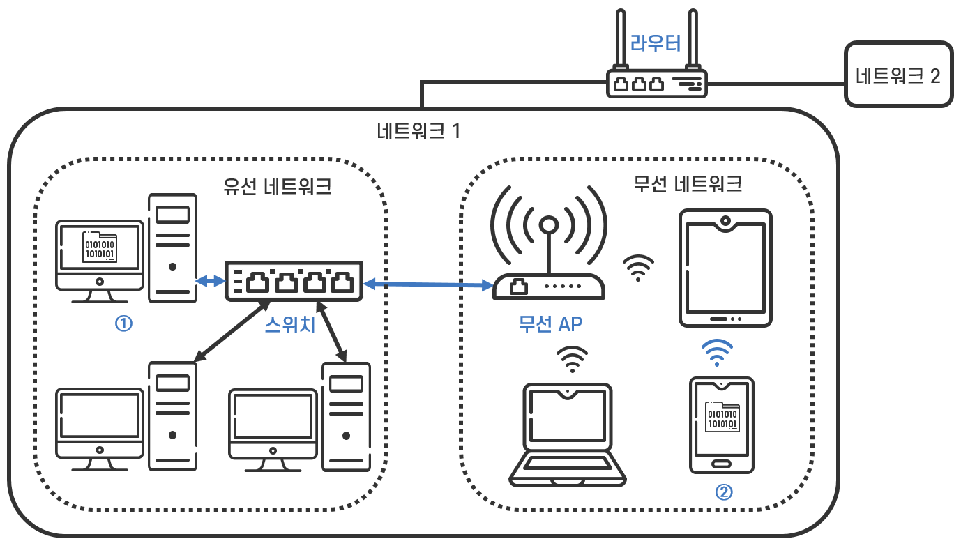 스위치와 무선 AP로 만들어진 유선 네트워크와 무선 네트워크는 라우터가 없어도 데이터 전송이 가능한 하나의 네트워크입니다. 이런 의미에서 네트워크를 연결하는 라우터는 동시에 네트워크를 구분 짓는 역할을 하며, 기술적인 의미에서 하나의 네트워크는 라우터에 의해 구분되는 범위입니다.