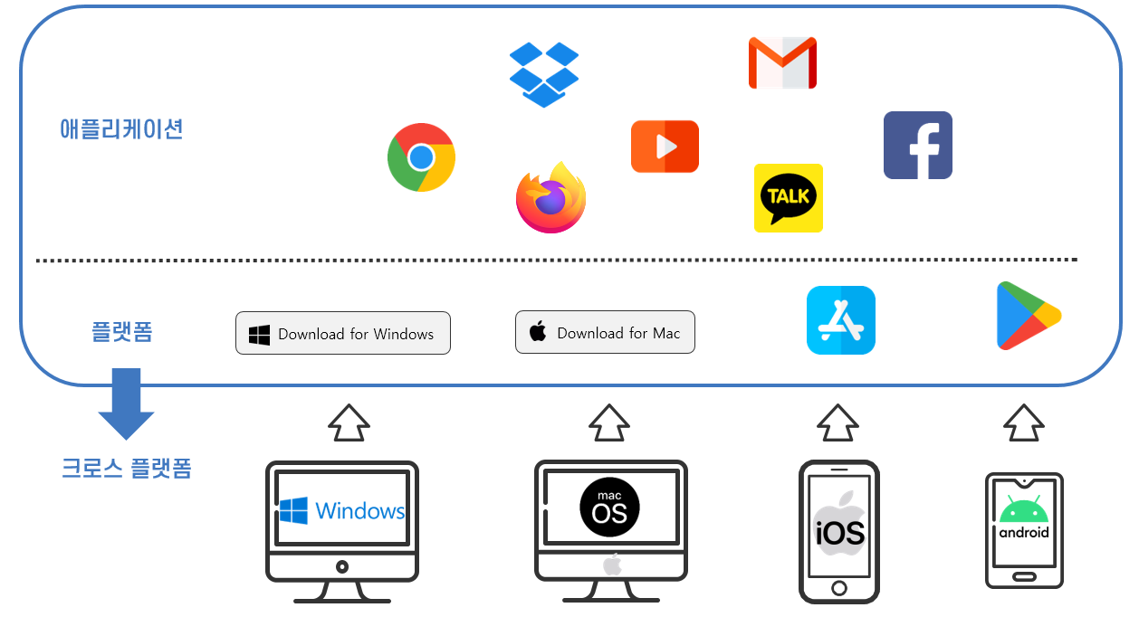 앞서 살펴본 것처럼 데스크톱 애플리케이션이나 모바일 앱을 만들 때는 운영체제마다 별도의 애플리케이션을 만들어야 하는 비효율성이 발생하고, 이런 비효율성을 해결하기 위해 크로스 플랫폼 도구가 개발되고 있습니다.