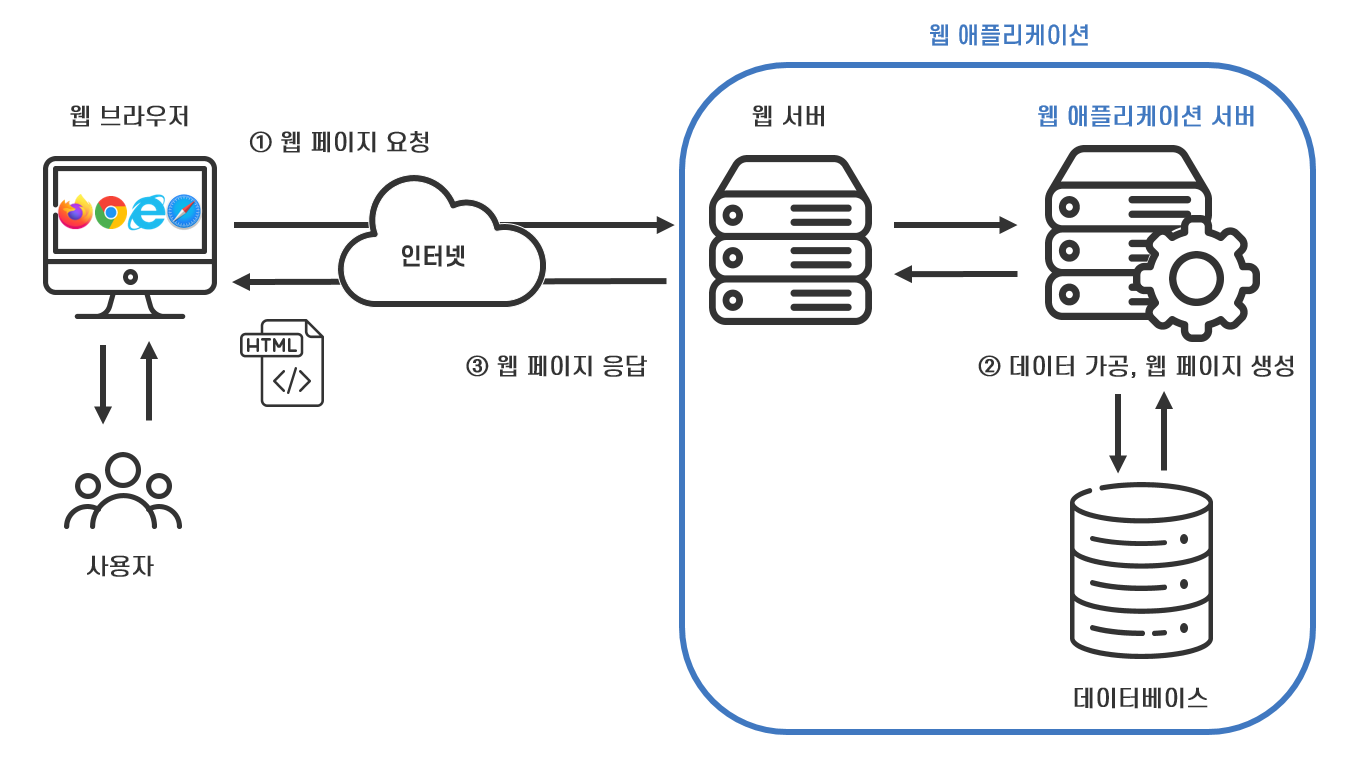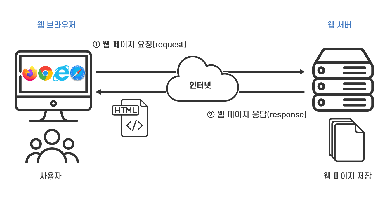웹 서비스 사용자는 웹 브라우저라는 전용 클라이언트 애플리케이션으로 웹 서버가 제공하는 서비스를 이용합니다. 웹브라우저가 웹 서버에게 필요한 웹페이지를 요청(request)하면 웹서버가 이에 응답(response)하여 웹페이지를 보내주고 웹 브라우저가 이 웹페이지를 받아 사용자에게 보여주는 것입니다.