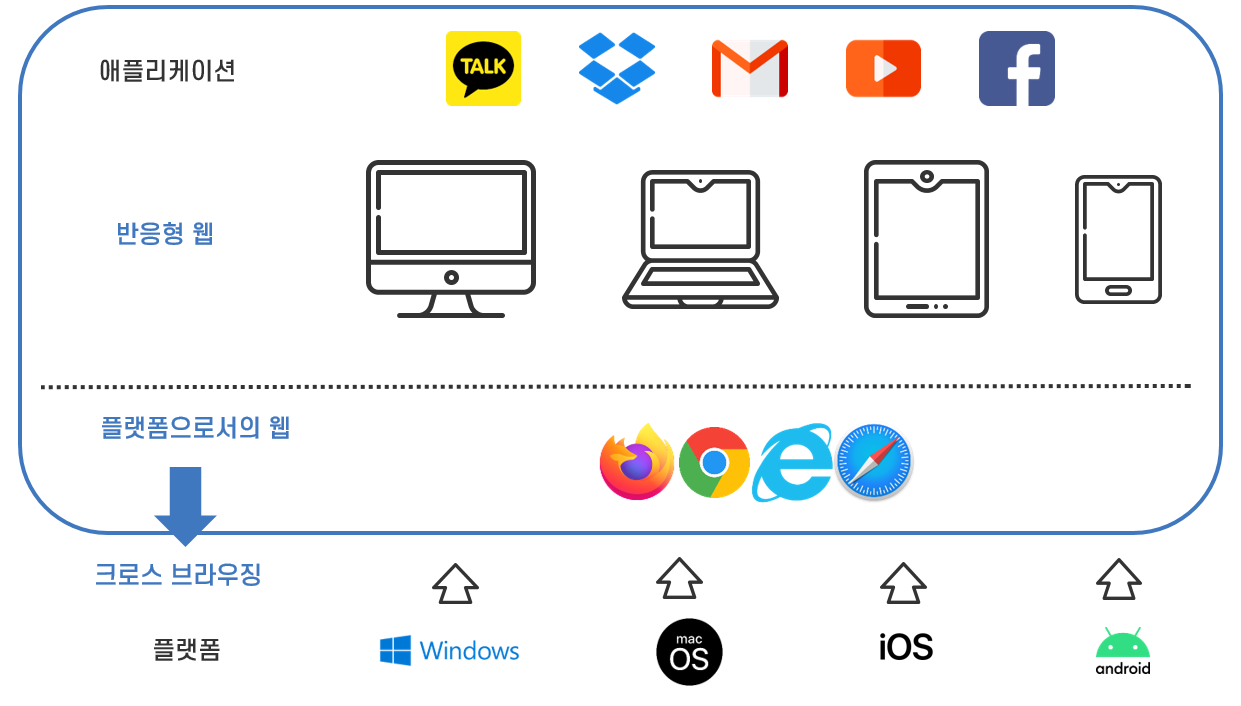 또한 서비스 사용자는 인터넷만 연결하면 별도의 클라이언트 애플리케이션의 설치 없이 웹브라우저가 설치되어 있는 PC, 노트북, 스마트폰 등 다양한 컴퓨터에서 서비스를 이용할 수 있습니다. 웹브라우저가 어떤 컴퓨터 환경에서도 웹 애플리케이션을 실행시켜주는 플랫폼 역할을 하여 서비스 개발자는 윈도우, mac OS, 안드로이드 같은 다양한 운영체제를 고려하지 않고 웹브라우저에 어떤 화면을 보여줄지, 어떻게 사용자와 상호작용을 할지만 고민*하면 됩니다.