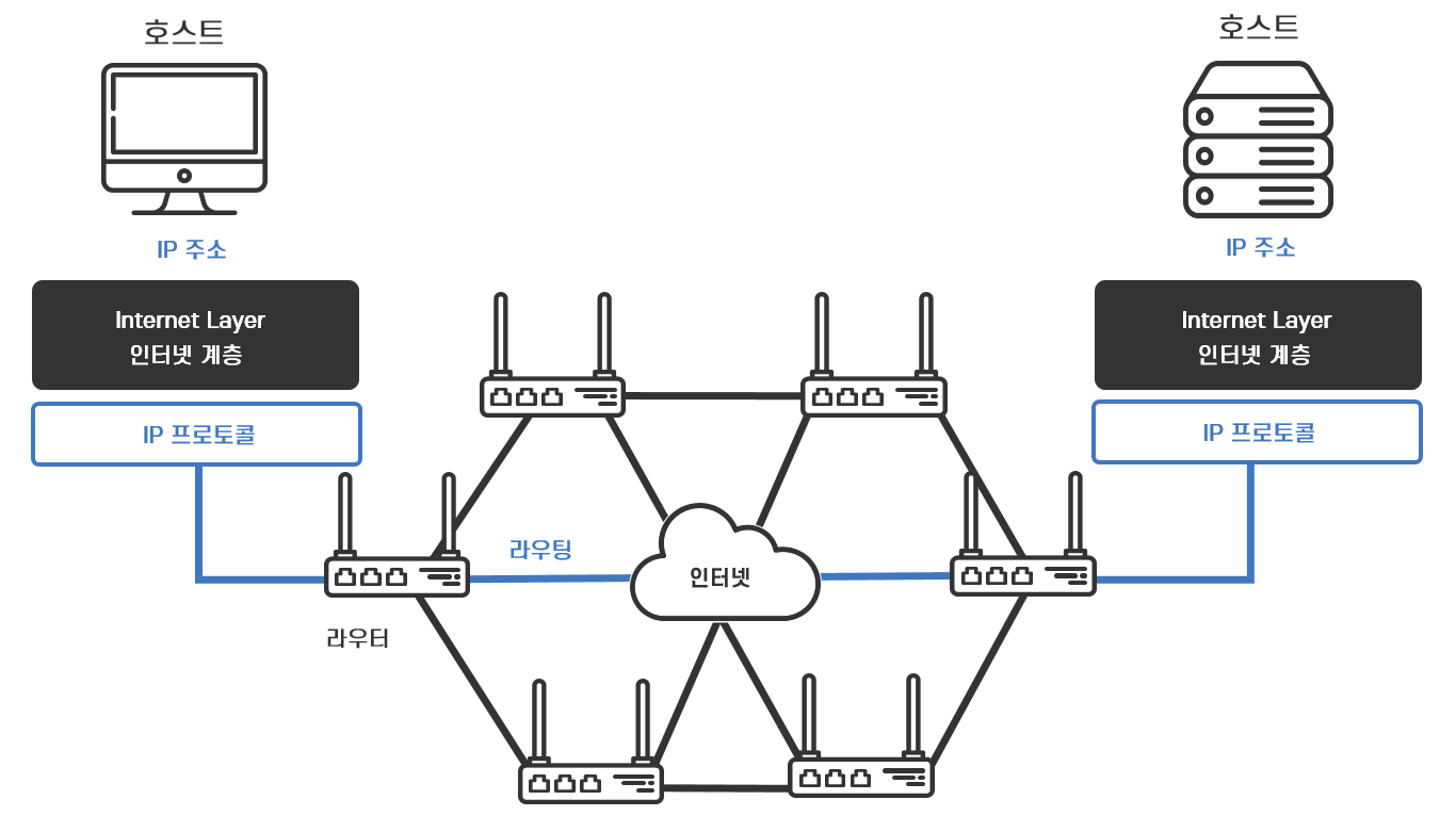 따라서 인터넷으로 연결된 모든 호스트와 중간 노드인 라우터는 반드시 IP 계층의 기능을 갖고 있어야 합니다.