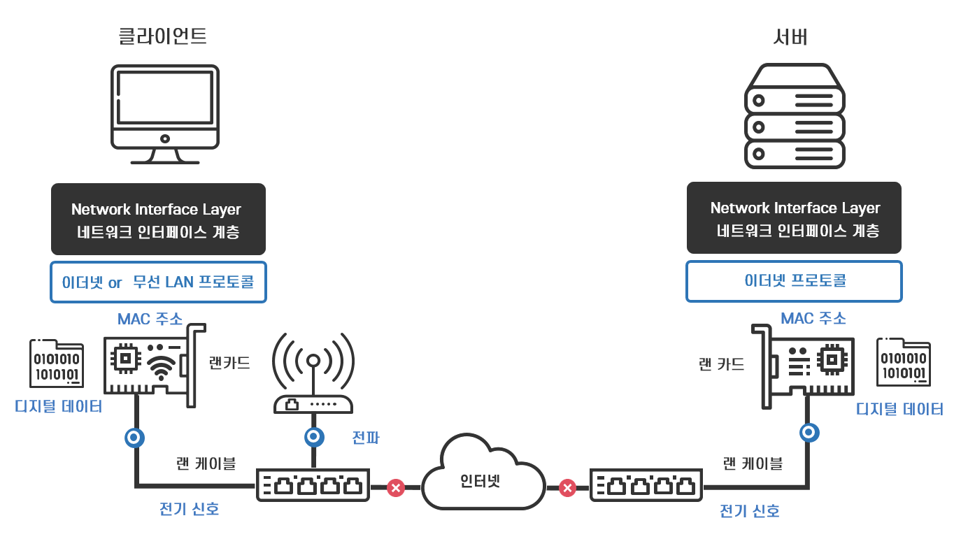 TCP/IP 모델 최하층에 위치한 네트워크 인터페이스 계층은 이름처럼 인접한 네트워크 기기 간에, 즉 전송 매체로 연결되어 전기신호나 전파가 도달하는 범위에서 데이터를 전송하는 역할을 합니다. 네트워크 인터페이스 계층이 직접 연결된 네트워크용 하드웨어 기기 간에 데이터 전송을 제어함으로써 상위 계층은 하드웨어의 종류에 상관없이 통신할 수 있게 됩니다.