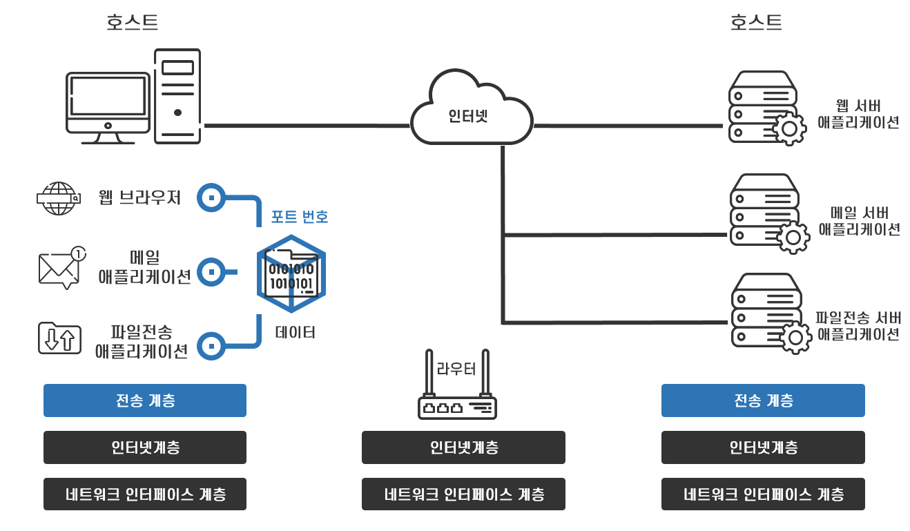 네트워크 인터페이스 계층과 인터넷 계층은 정확한 데이터의 수신지 컴퓨터까지 최적의 경로를 찾아 데이터를 전송할 뿐 데이터 전송의 신뢰성이나 수신지 컴퓨터 내에서 데이터의 배분에는 관여하지 않습니다. 전송 과정에서 데이터의 손상이나 유실없이 제대로 전달되는지, 데이터가 효율적으로 전달되는지, 목적지 컴퓨터 내의 어떤 애플리케이션에 데이터를 전달해야 하는지는 전송 계층에서 처리합니다. 웹 브라우저로 여러 개의 웹사이트에 접속하거나 웹 브라우저뿐만 아니라 카카오톡 등 여러 애플리케이션으로 동시에 인터넷을 사용하더라도 문제없이 애플리케이션이 동작하는 것은 바로 이 전송 계층의 역할 덕분입니다.