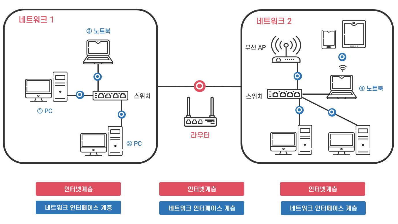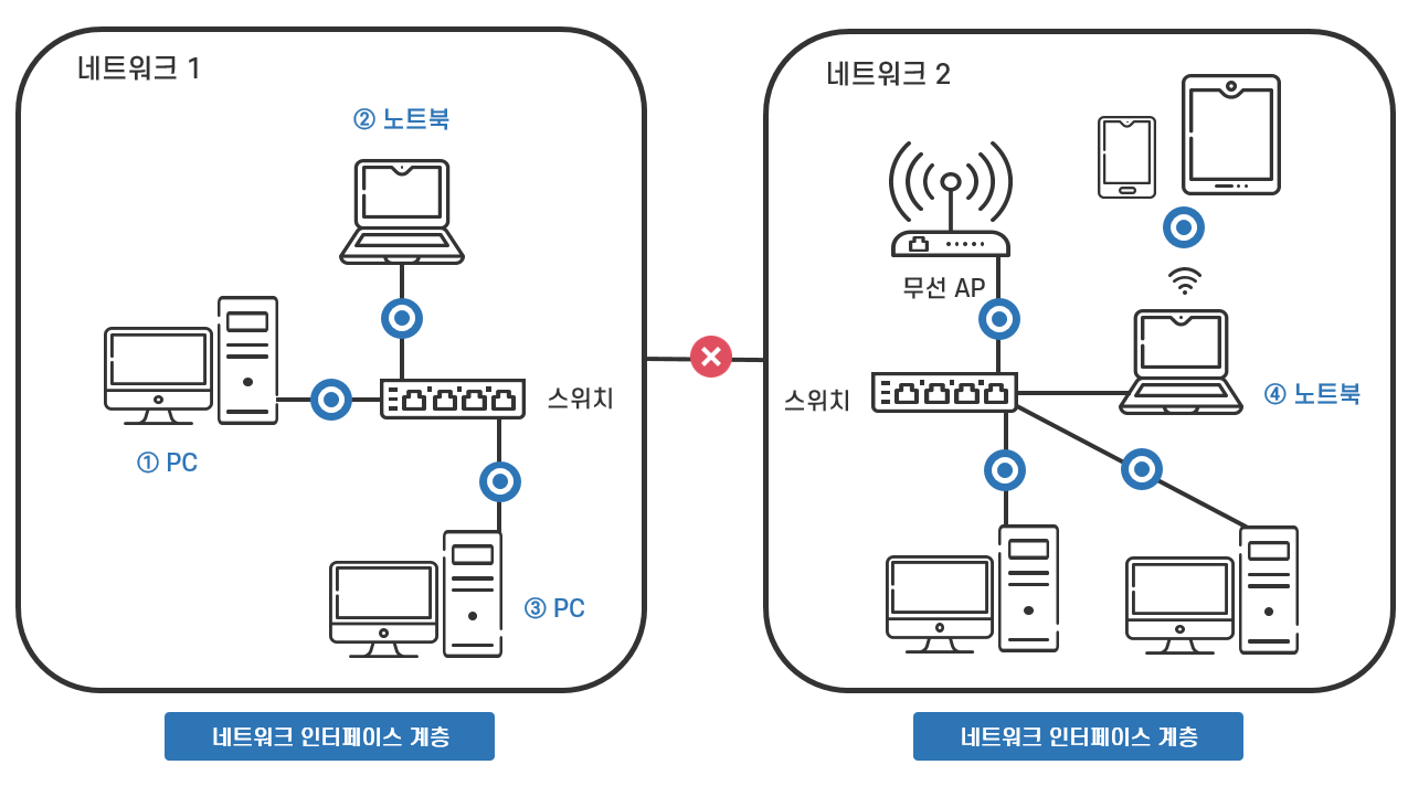 그러나 물리적으로 직접 연결되지 않고 다른 네트워크에 속한 ①번 PC와 ④번 노트북 간의 데이터 전송은 네트워크 인터페이스 계층만으로는 불가능하고 아래에서 설명할 인터넷 계층의 기능이 필요합니다.