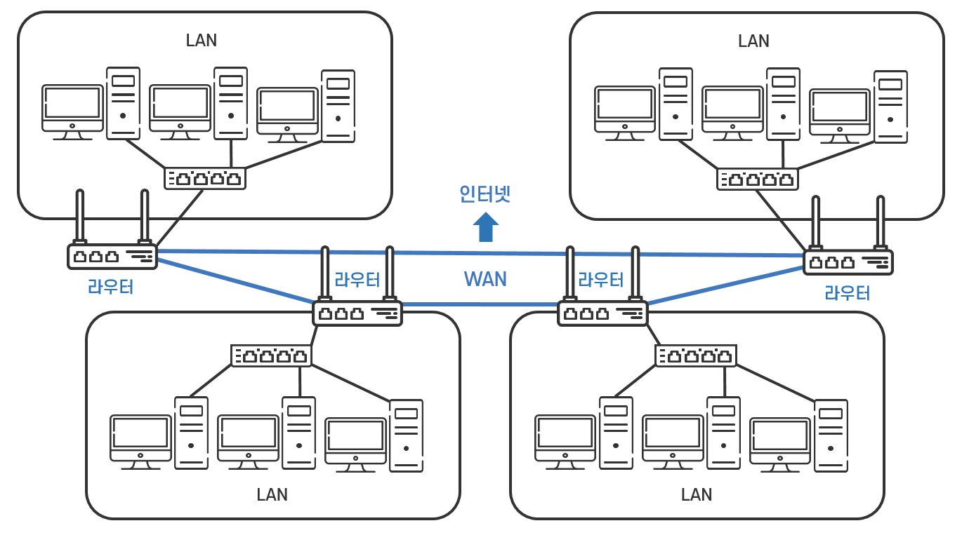 앞서 LAN을 연결하여 WAN을 구축하고, 전 세계의 LAN을 연결하여 인터넷을 만드는 장비가 라우터라고 한 것은 라우터가 네트워크 간에 데이터를 전송하는 장비이기 때문입니다.