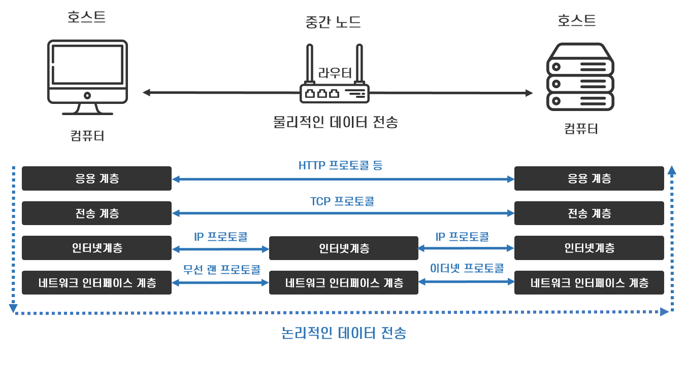 인터넷에서는 컴퓨터와 네트워크에 연결된 장비들이 기능에 따라 TCP/IP 4개의 계층 중 필요한 계층의 프로토콜을 구현하면 정상적인 데이터 통신을 할 수 있습니다. 데이터를 송수신하고 애플리케이션을 실행시키는 컴퓨터, 즉 호스트는 4개 계층 모두의 프로토콜을 구현해야 하지만, 애플리케이션에 관심을 갖지 않고 호스트 간의 데이터 전송을 돕는 중간 노드인 라우터는 네트워크 인터페이스 계층과 인터넷 계층의 프로토콜만을 구현하면 됩니다.