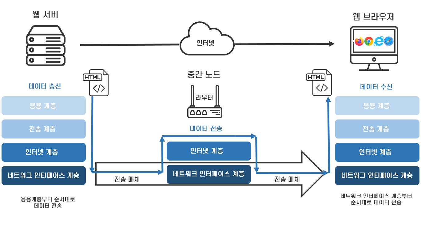 웹 서버와 웹 브라우저가 인터넷에서 데이터 통신을 하는 전체적인 과정은 다음 <그림 1>과 같습니다. 애플리케이션을 실행시키는 웹 서버 컴퓨터와 웹 브라우저 컴퓨터는 각각 4개의 계층을 순차적으로 통과하면서 각각의 프로토콜에 따라 데이터를 처리하고, 네트워크를 연결하여 인터넷을 만드는 중간 노드인 라우터는 네트워크 인터페이스 계층과 인터넷 계층의 프로토콜에 따라 데이터를 처리합니다.