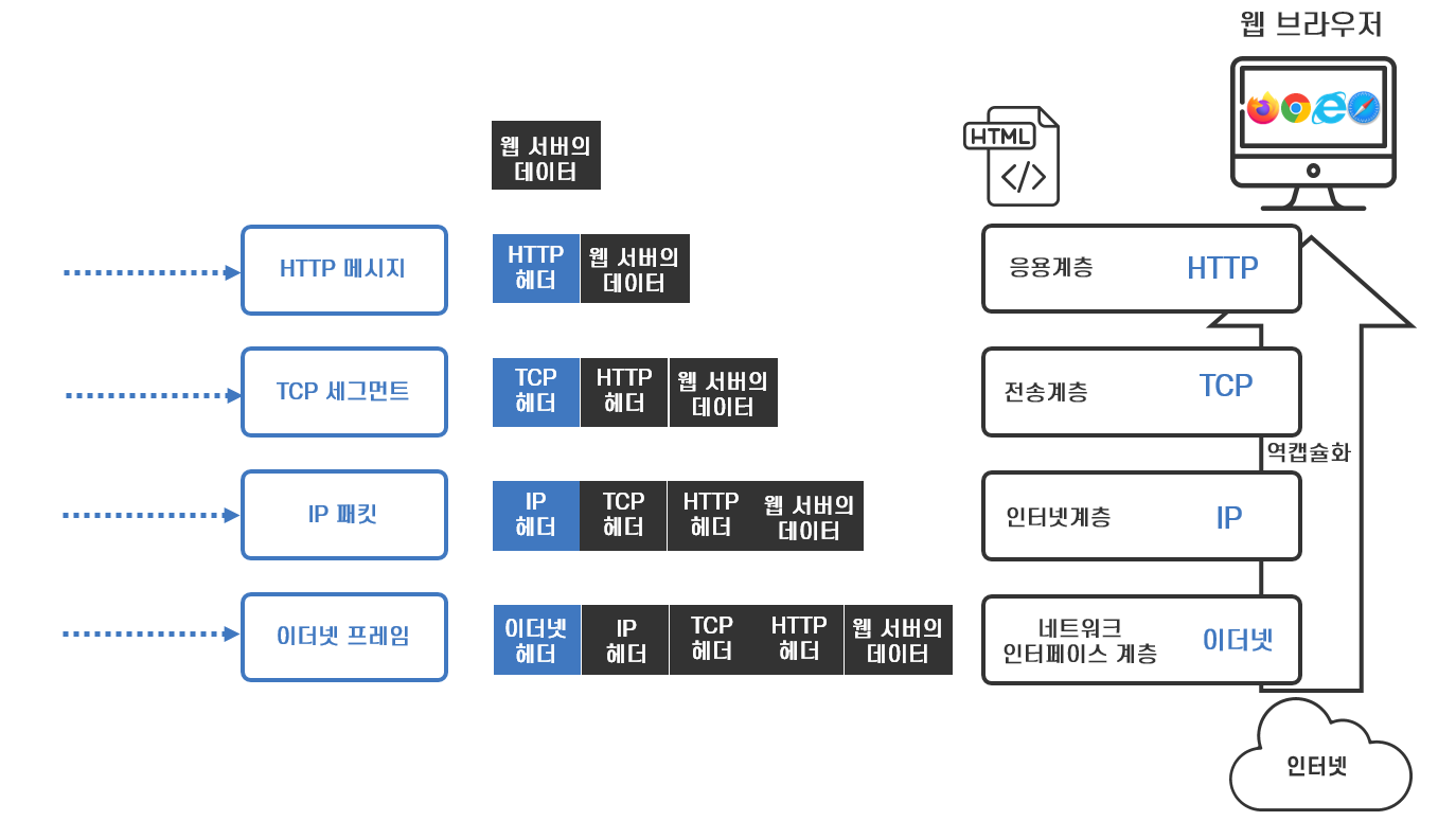 이번 포스팅에서는 인터넷을 대표하는 웹 서비스에서 웹 서버와 웹 브라우저가 캡슐화와 역캡슐화를 거쳐 통신하는 과정에 대해 살펴보도록 하겠습니다.