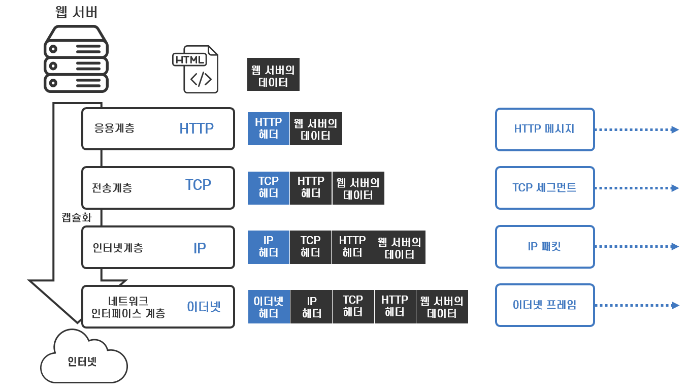 응용 계층은 HTTP 헤더를 읽고 웹 서비스를 제공할 수 있도록 데이터를 처리하여 웹브라우저에서 웹페이지를 보여줍니다.