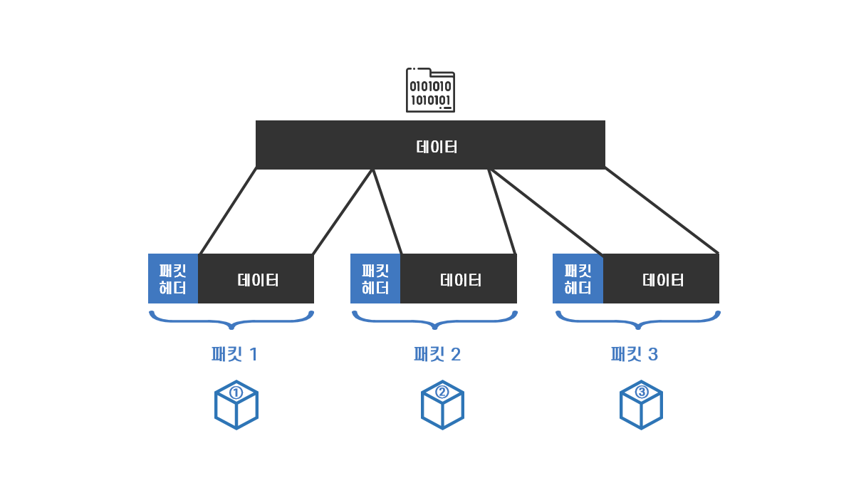 패킷은 인터넷에서 전송되는 데이터의 기본 단위로 '헤더'와 '데이터 조각'이라는 두 부분으로 구성됩니다. 패킷의 헤더에 패킷의 송신지와 수신지 등 패킷의 전송을 제어할 수 있는 정보가 담겨 있기 때문에 패킷이 송신지와 수신지에서 하나의 단위로 취급되어 전송하는 데이터 단위가 될 수 있습니다. 보내는 사람의 주소와 받는 사람의 주소가 씌여진 소포나 택배가 하나의 단위로 배송되는 것과 같은 원리입니다.