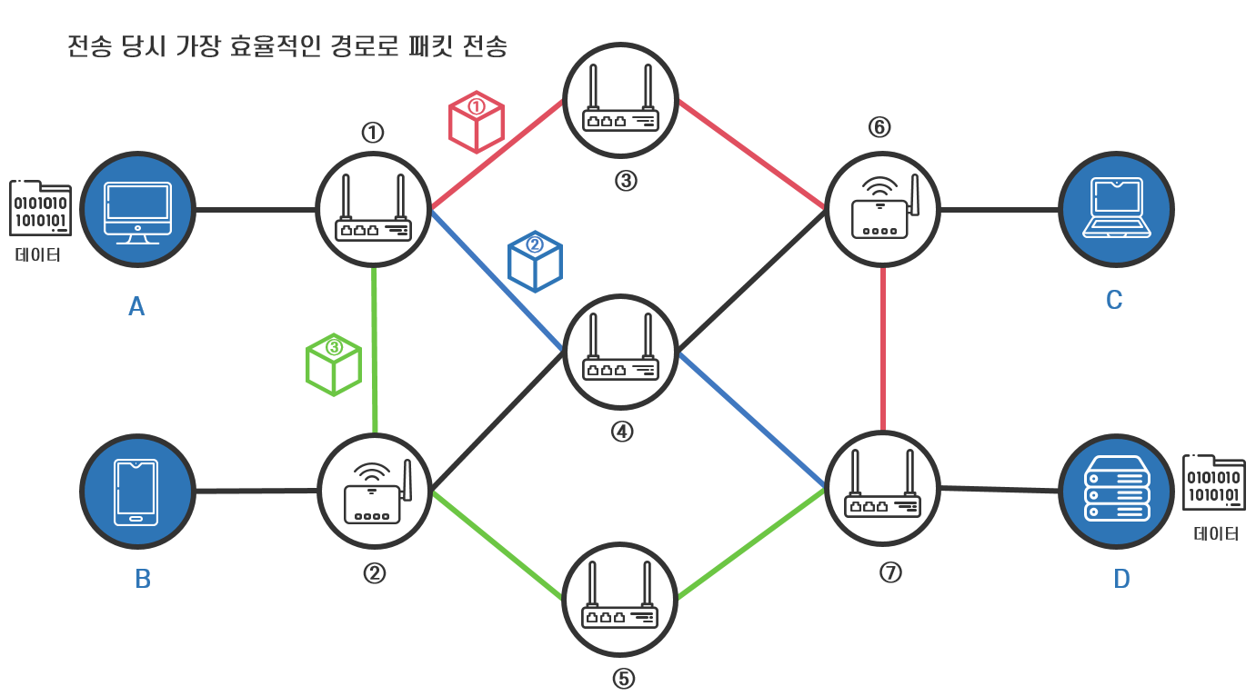아래 <그림 4>와 같이 송신 호스트 A가 수신 호스트 D로 전송한 패킷은 중간 노드인 라우터의 라우팅에 따라 패킷 ①은 노드 ① ⇒ 노드 ③ ⇒ 노드 ⑥ ⇒ 노드 ⑦의 경로로, 패킷 ②는 노드 ① ⇒ 노드 ④ ⇒ 노드 ⑦의 경로로, 패킷 ③은 노드 ① ⇒ 노드 ② ⇒ 노드 ⑤ ⇒ 노드 ⑦의 경로로 전송될 수 있습니다.