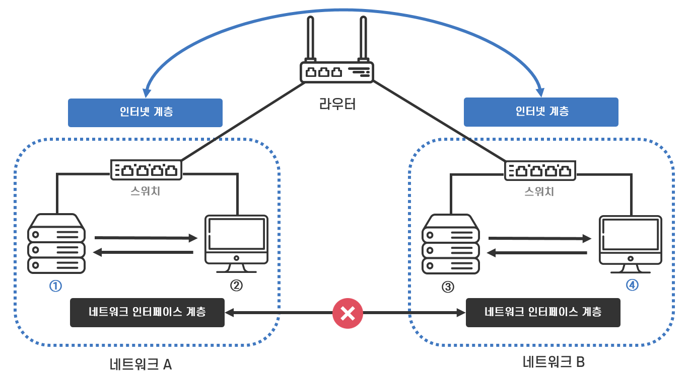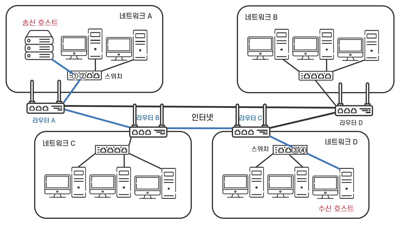 앞서 살펴본 네트워크 인터페이스 계층의 역할은 어디까지나 물리적으로 직접 연결된 컴퓨터 간에 데이터를 전송하는 데 있습니다. 따라서 네트워크 인터페이스 계층의 기능으로 <그림 1>에서 직접 연결된 ①번과 ②번 컴퓨터 간에, ③번과 ④번 컴퓨터 간에는 통신이 가능하지만, 직접 연결되지 않은 ①번과 ④번 컴퓨터 간에는 통신이 불가능합니다.