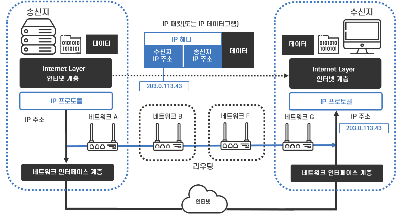 수많은 네트워크가 연결된 인터넷에서 데이터가 송신지를 출발하여 수신지에 도착하기까지 수많은 라우터를 통과하게 됩니다. 그 과정에서 데이터가 길을 잃지 않고 정확한 목적지에 도착할 수 있도록 기능하는 것이 IP 프로토콜입니다. IP 프로토콜에 따라 네트워크에 연결된 컴퓨터는 물리적 연결이나 거리에 상관없이 통신이 가능하기 때문에 인터넷을 지탱하는, TCP/IP 계층 모델에서 가장 중심이 되는 프로토콜입니다.