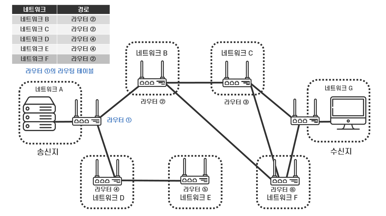 <그림 2> 에서 네트워크 A에 속한 ①번 컴퓨터가 네트워크 G에 속한 ②번 컴퓨터에게 데이터를 전송하기 위한 경로는 A → B → C → G, A → B → F → G, A → D → E → C → G 등 여러 개가 있습니다. 데이터의 최종 목적지인 ②번 컴퓨터의 IP 주소를 바탕으로 각각의 라우터는 자신이 알고 있는 경로 중 네트워크 G로 가는 최적의 경로를 찾아 그 경로에 상에 있는 가까운 라우터에게 데이터를 전송합니다. 그 결과 라우팅에 의해 선택된 경로인 A → B → F → G에 따라 ①번 컴퓨터에서 ②번 컴퓨터로 데이터가 전송됩니다.
