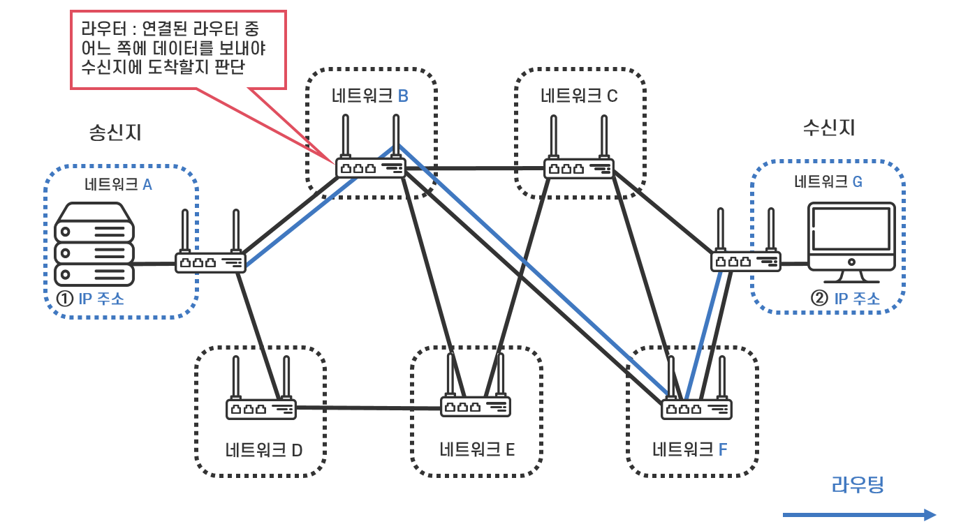 IP 프로토콜은 ① IP 주소(최종 목적지 결정)와 ② 라우팅(목적지까지 경로 결정)으로 그 기능을 구현합니다.