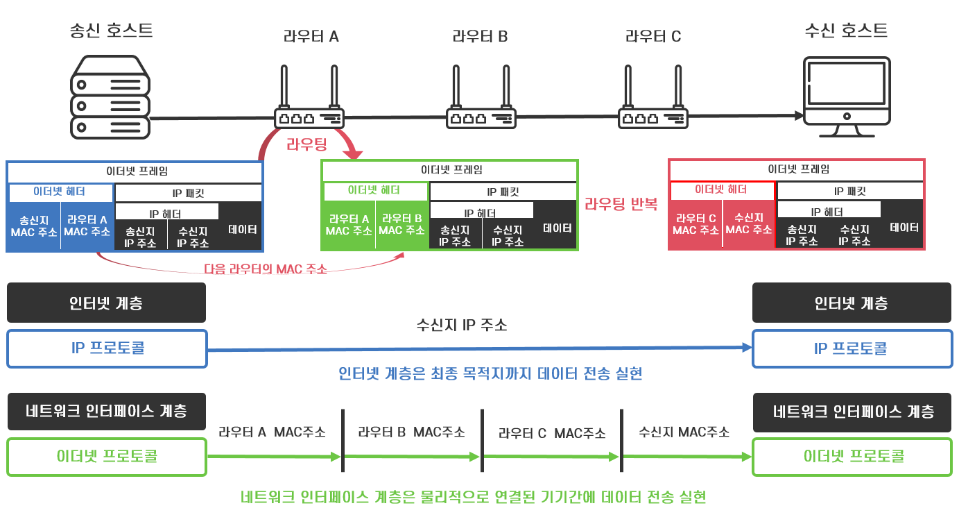 이렇게 라우터를 통과할 때마다 패킷의 최종 목적지인 IP 주소는 변하지 않지만, 라우팅 결과 선택된 경로에 따라 패킷의 다음 전송지인 MAC 주소가 변경되는 과정이 반복됩니다. 라우팅을 통해 MAC 주소가 변경되면서 물리적인 패킷 전송이 이어지고, 수많은 라우터를 거쳐 수신지 호스트와 직접 연결된 라우터를 통해 최종 목적지인 수신지 호스트에 IP 패킷이 전송되는 것입니다.