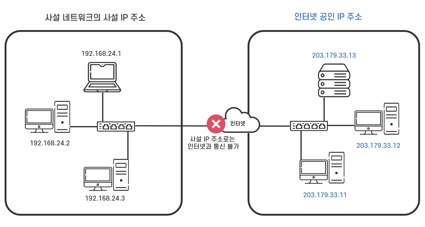 IP 주소는 IP 프로토콜을 사용해서 네트워크를 만들 때 사용하는 주소이고, IP 프로토콜은 네트워크를 연결하는 규칙이기 때문에 사내 네트워크 같은 독립적인 네트워크를 만들 때도 사용됩니다. 이런 인터넷과 독립적인 사설 네트워크에서 사용하는 IP 주소를 사설 IP 주소 (또는 프라이빗 IP 주소, private IP address) 라고 합니다.