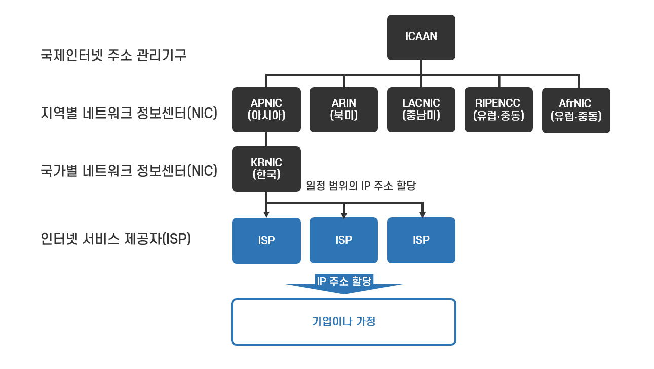 인터넷이 보급된 초기에는 사용자가 IP 주소 관리기관(NIC)에 직접 IP 주소 신청을 해서 공인 IP 주소를 취득해야 했습니다. 그러나 인터넷이 상용화되어 사용자가 ISP(인터넷 서비스 제공자)를 통해 인터넷 서비스를 이용하게 되면서 IP 주소 관리기관이 ISP에 공인 IP 주소를 할당하고 ISP가 사용자에게 공인 IP 주소를 부여하고 있습니다. 말하자면 ISP가 IP 주소 관리기관으로부터 할당받은 공인 IP 주소를 인터넷 사용자에게 분배하는 것입니다.