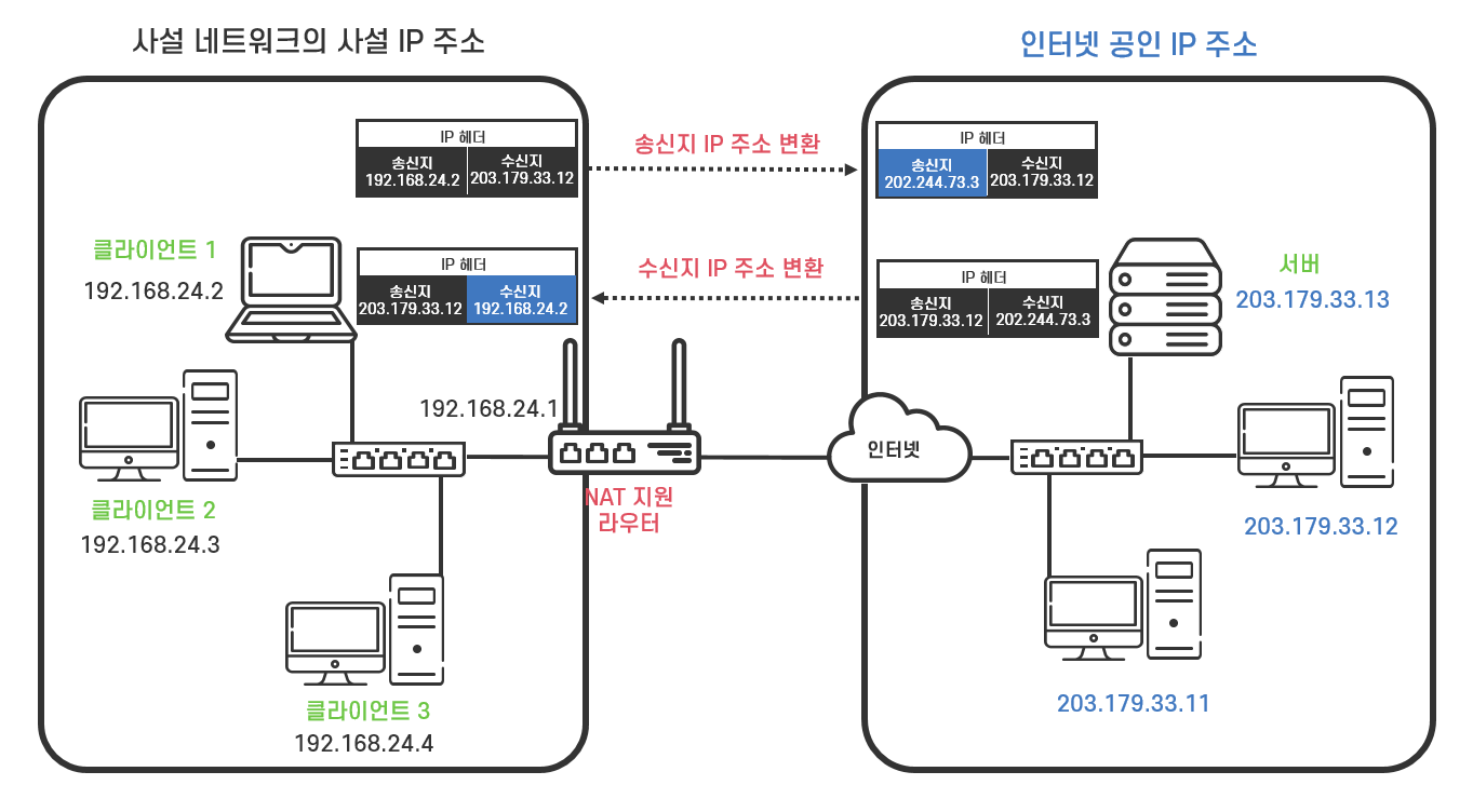 인터넷에 있는 서버 입장에서는 사설 네트워크에 있는 호스트의 존재를 모릅니다. 서버가 통신하는 상대는 NAT 라우터이기 때문입니다. 인터넷에서는 사설 네트워크에 있는 호스트들을 대신해 NAT 라우터가 사실상 하나의 공인 IP 주소를 갖는 하나의 호스트 역할을 합니다. 사설 네트워크를 떠나 인터넷으로 가는 패킷은 송신지 주소로 NAT의 공인 IP 주소인 202.244.73.3을 가져야 하며, 인터넷에서 사설 네트워크로 들어오는 패킷은 수신지 주소로 NAT의 공인 IP 주소인 202.244.73.3을 가져야 합니다.