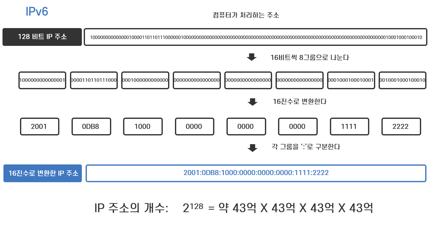 32 비트의 IPv4 주소가 할당할 수 있는 IP 주소는 2의 32승인 약 43억 개였습니다. IPv6는 128 비트를 사용하기 때문에 2의 128승 개의 주소를 할당할 수 있습니다. 이는 43억을 4번 곱한 숫자로 거의 무한대의 IP 주소를 할당할 수 있게 되었습니다.