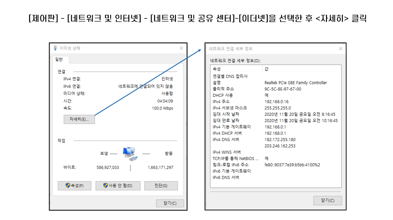 내 컴퓨터에서 [제어판]-[네트워크 및 인터넷] -[네트워크 및 공유 센터]-[이더넷]을 선택한 후 <자세히>를 클릭하면 다음 <그림 6>과 같이 네트워크 연결 세부 정보를 확인할 수 있습니다. 내 컴퓨터가 인터넷에 접속하여 공인 IP 주소를 할당받은 시간이 임대 시작 날짜입니다. 기본 임대 기간은 ISP에 따라 다르고 인터넷에 접속되어 있는 동안은 계속해서 갱신됩니다.