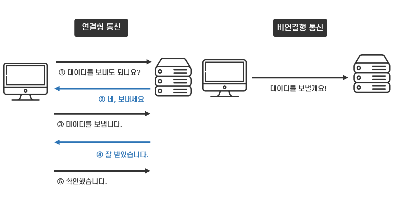 연결형 통신은 통신 상대방과 확인해 가면서 통신하는 방식이고, 비연결형 통신은 상대방의 확인을 거치지 않고 일방적으로 데이터를 전송하는 방식입니다.