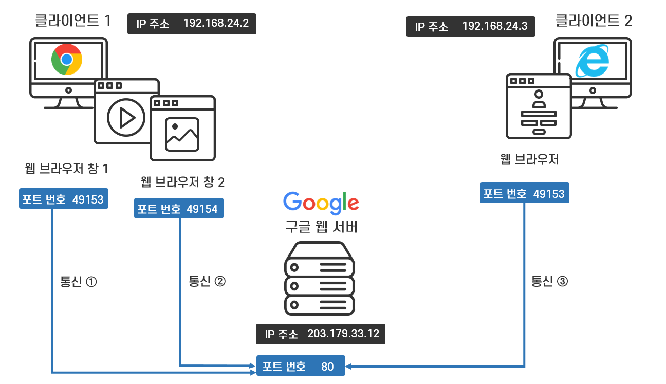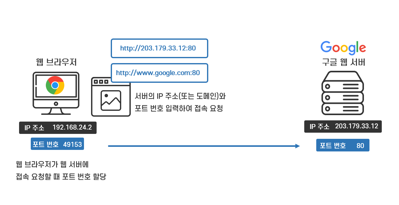 웹 브라우저가 웹 서버의 IP 주소와 포트 번호로 웹 페이지를 제공하는 웹 서버 애플리케이션에 접속할 때 웹 브라우저가 설치된 운영체제에서 웹 브라우저가 사용할 임의의 포트 번호를 할당합니다. 웹 서버 애플리케이션은 이 포트 번호로 웹 브라우저와 통신하며 웹 페이지를 전송하게 됩니다.