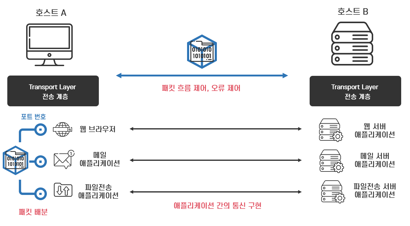 애플리케이션이라는 최종 목적지까지 데이터 전송을 책임지는 것이 전송 계층의 또 다른 역할입니다. 즉, 전송 계층은 다양한 애플리케이션이 동작하는 컴퓨터 내에서 어떤 애플리케이션이 사용하는 데이터인지 식별하여 수신지 컴퓨터에 도착한 데이터를 수신지 컴퓨터 내의 애플리케이션에 배분하는 역할을 합니다. 인터넷 계층이 컴퓨터(호스트) 간의 데이터 통신을, 전송 계층이 애플리케이션 간의 데이터 통신을 구현한다고 볼 수 있습니다. 인터넷 계층이 호스트를 식별하기 위해 IP 주소를 사용하는 것처럼, 전송 계층에서는 애플리케이션을 식별하기 위해 포트 번호를 사용합니다.