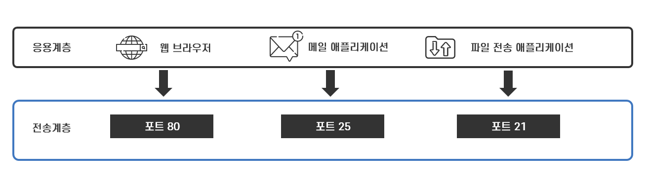 웹 브라우저로 여러 웹 페이지를 보거나, 동시에 여러 애플리케이션으로 인터넷에 접속하고 있을 때 서로 다른 데이터가 오고 가는 상황에서도 애플리케이션끼리 혼선이 생기지 않는 것은 전송 계층이 포트를 여러 개 사용하여 각각 따로 통신을 하기 때문입니다.
