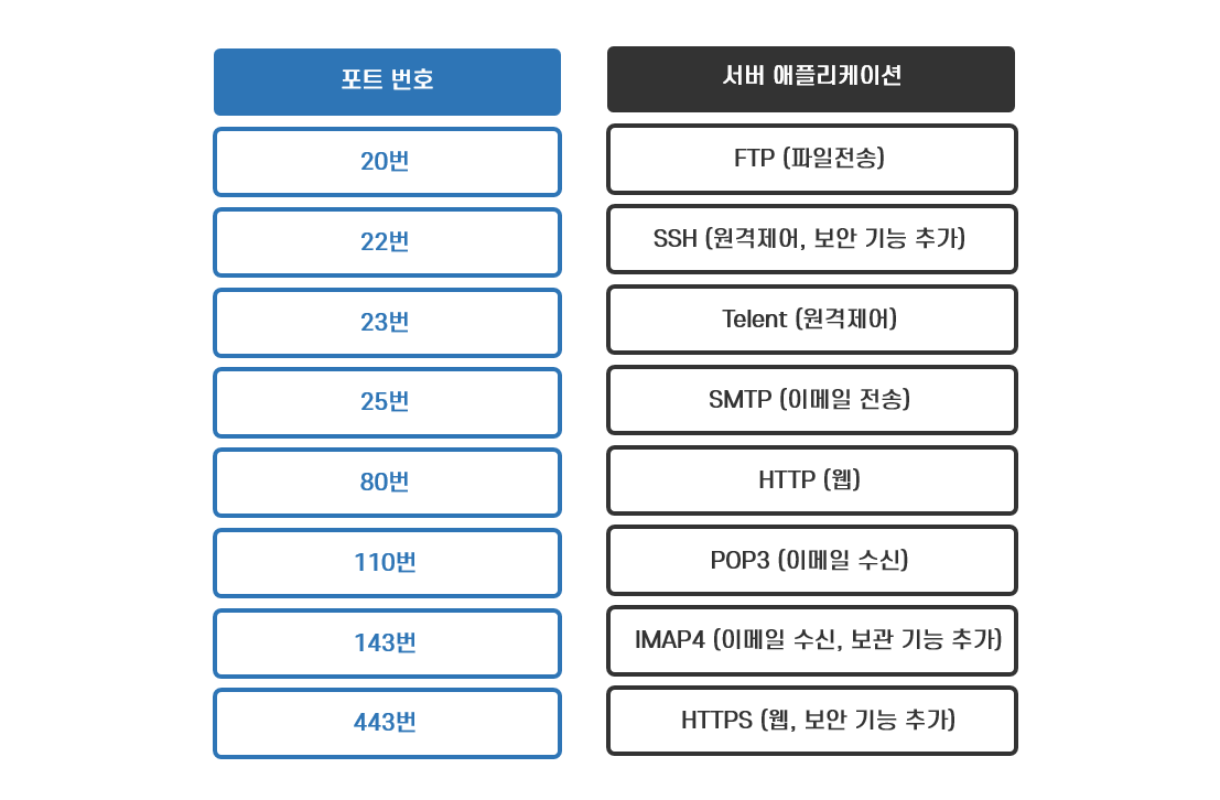 많은 클라이언트가 접속하는 서버 애플리케이션에는 미리 할당한 포트 번호를 열어 놓아 언제든 클라이언트가 편리하게 접속할 수 있게 한 것입니다. 반드시 정해진 포트 번호를 사용해야 한다는 절대적인 규칙이 있는 건 아니지만*, 웰 노운 포트 번호를 다른 용도로 사용하면 혼란을 야기할 수 있으므로 특별한 이유가 없다면 정해진 용도 외에는 사용하지 않는 것이 좋습니다.