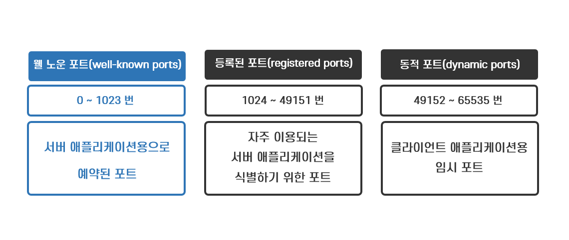 16비트를 사용하는 포트 번호는 0~65535번까지 65536(2의 16승) 개의 번호를 사용할 수 있습니다. IP 주소를 관리하는 ICANN은 아래 <그림 3>과 같이 포트 번호를 크게 세 종류로 구분하였습니다.