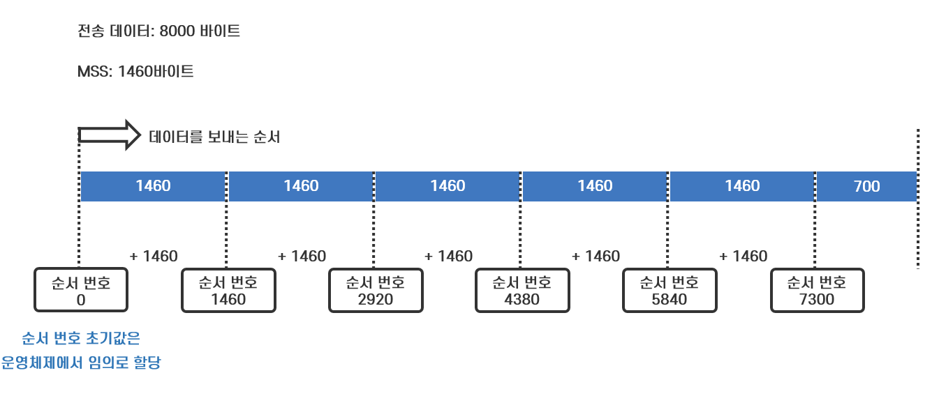 TCP에서 데이터를 분할하는 단위를 MSS(Maximum Segment Size, 최대 세그먼트 길이)라고 하며, MSS는 송신지와 수신지가 원활한 통신을 하기 위해 서로 합의하여 결정합니다. 일반적으로 사용하는 MSS의 표준 크기는 1,460 바이트입니다. TCP는 MSS를 넘는 크기의 데이터를 MSS 단위로 분할합니다.