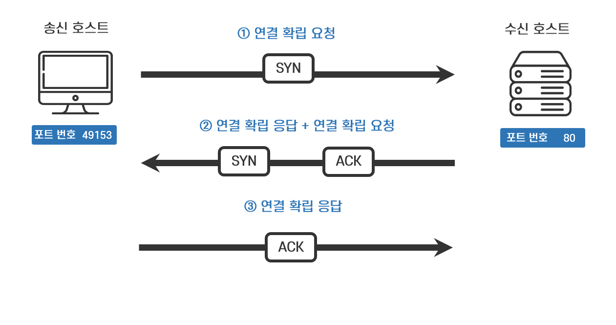 연결 확립은 3-way 핸드 셰이크(3-way handshake)라고 하는 3단계 과정을 거쳐 확립됩니다.