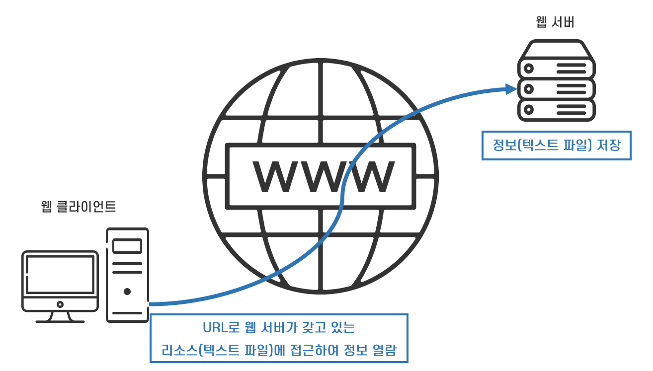 World Wide Web, 즉 전 세계의 컴퓨터를 거미줄같이 연결한 가상의 공간을 만들어 정보를 공유하고자 했던 팀 버너스 리는 세상의 모든 정보에 URL을 붙여 전 세계에 흩어져 있는 컴퓨터에 저장된 파일을 식별하여 접근할 수 있는 시스템을 설계했습니다. 정보를 담은 텍스트 파일 등의 리소스에 URL을 붙여 웹 서버에 저장하고 URL을 공개함으로써, 누구나 URL로 웹 서버에 있는 리소스에 접근할 수 있게 한 것입니다.