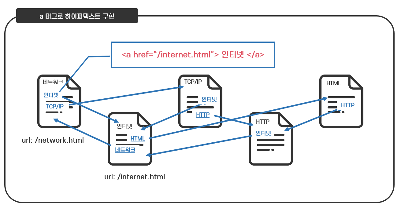 특정한 정보를 담은 HTML 문서를 만들어 웹 서버에 저장하고, 이 HTML 문서가 저장된 위치를 URL로 지정하여, 이 문서와 관련 있는 다른 HTML 문서의 문자열에 URL을 삽입한 a 태그로 마크업함으로써 특정 정보가 다른 정보와 연결되는 하이퍼텍스트가 구현되는 것입니다.