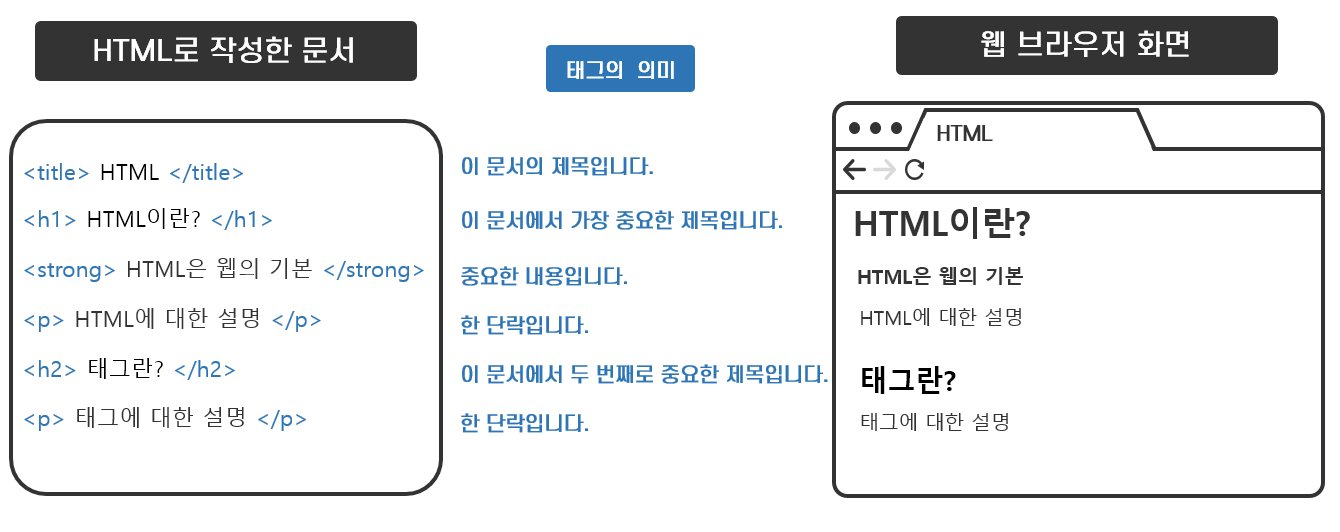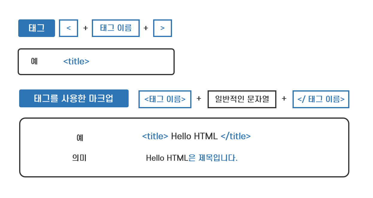 HTML은 태그(Tag)라는 기호를 사용해 텍스트의 특징과 의미를 마크업 하는 방식의 언어입니다. 태그는 <title>과 같이 꺽쇠 괄호인 '<>'로 둘러싸인 태그 이름(Tag Name)을 의미합니다. 텍스트 내용에 해당하는 일반적인 문자열과 태그에 사용되는 문자열을 구분하기 위해 '<>' 기호를 사용한 것입니다. <title>이라는 태그로 마크업 된 일반적인 문자열은 이 문자열이 제목이라는 의미를 담고 있습니다. title과 같은 태그 이름과 의미는 HTML 사양*에 정의되어 있습니다.