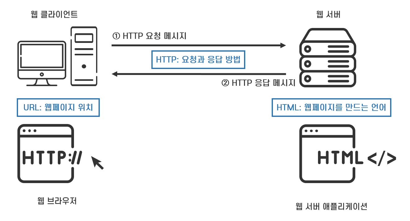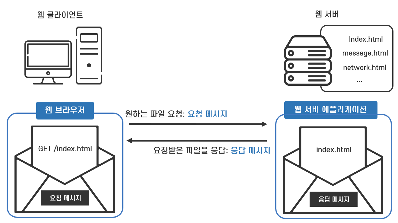 HTTP 프로토콜로 주고받을 데이터의 형식은 메시지입니다. 웹 클라이언트 애플리케이션은 웹 서버가 갖고 있는 HTML 파일 중에서 보고 싶은 파일을 보내 달라고 요청하는 메시지를 보냅니다. 웹 서버 애플리케이션은 웹 클라이언트 애플리케이션의 요청에 응답하여 보내 달라고 요청한 파일을 메시지에 담아 보냅니다. 이렇게 HTTP 프로토콜은 웹 클라이언트 애플리케이션이 요청 메시지(Request Message)를 보내고 웹 서버 애플리케이션은 응답 메시지(Response Message)를 보내는 단순한 방법으로 통신합니다.