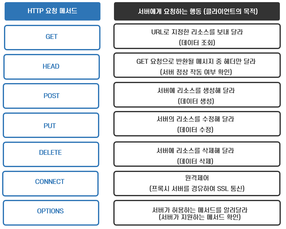 웹 브라우저가 웹 서버에게 어떻게 해달라는 요청을 의미하는 HTTP 메서드는'GET', 'HEAD', 'POST'와 같이 한 단어로 되어 있습니다. HTTP가 정의한 대표적인 메서드는 아래 <그림 2>과 같습니다. HTTP 요청 매서드는 웹 브라우저가 웹 서버가 수행해주길 바라는 동작을 의미하기 때문에 HTTP 동사라고 부르기도 합니다.
