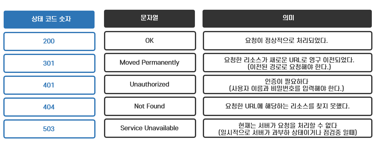 가장 흔하게 사용되는 상태 코드는 다음 <그림 7>과 같습니다.