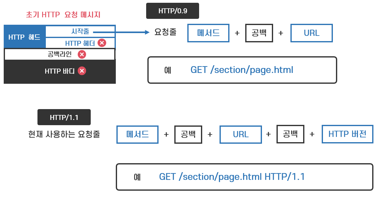 현재는 메서드와 URL에 클라이언트가 사용하는 HTTP 버전 정보를 추가한 요청줄을 사용합니다. HTTP 버전에 따라 HTTP 메시지의 남은 구조(헤더와 본문)가 결정되기 때문에 HTTP 버전을 알려주는 것입니다.