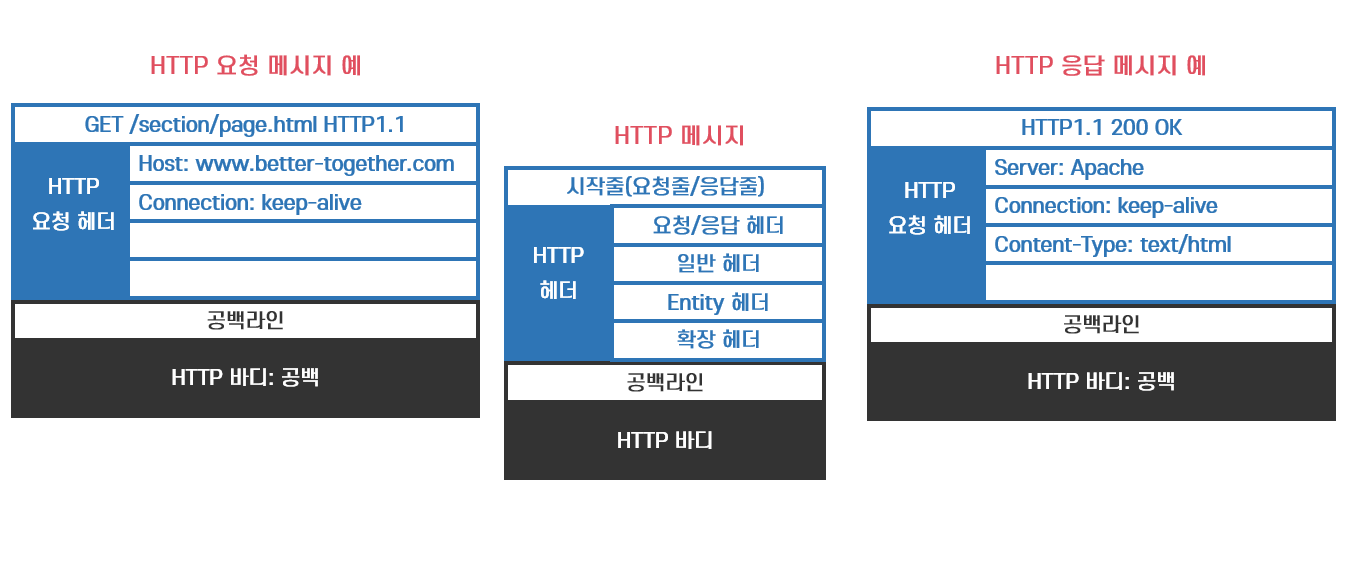 따라서 HTTP 메시지는 HTTP 헤드와 HTTP 본문으로 구성됩니다. HTTP 헤드와 HTTP 본문은 빈 줄(Blank line)인 공백 라인(Empty Line)으로 구분합니다. 공백 라인으로 요청과 응답에 관한 모든 정보가 전송되었음을 알려주는 것입니다.