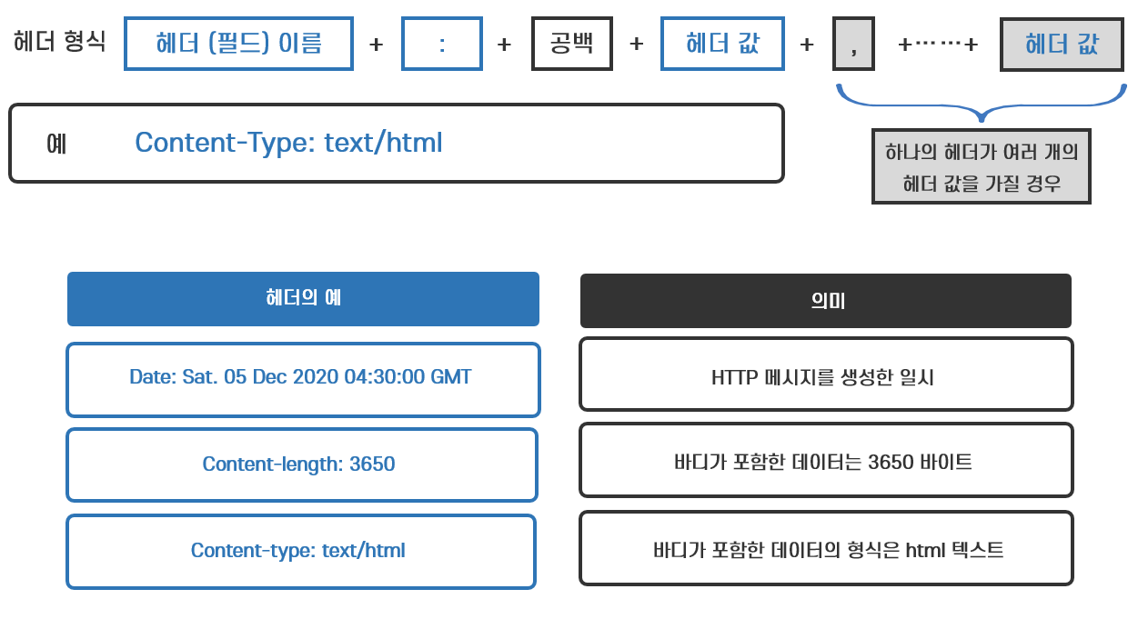 기본적으로 헤더는 '헤더의 이름'을 대소문자의 구분 없는 문자열로 표시하고, 다음에 ':(콜론)'을 붙인 후 '헤더 값'을 입력하여 한 줄(Header Line)로 표시합니다. 헤더의 형태와 흔히 쓰이는 헤더는 다음 <그림 9>와 같습니다.