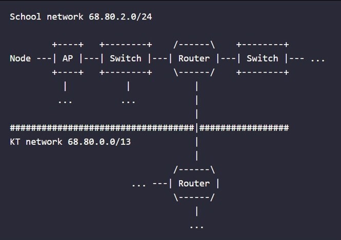 '스위치들은 게이트웨이 라우터와 연결되어 있으며, 라우터는 SK브로드밴드나 KT와 같은 ISP(Internet Service Provider)의 네트워크에 연결되어 있다.'