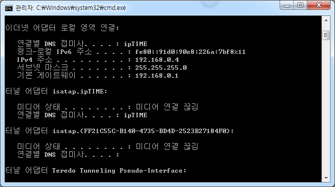 필자의 경우 기본 게이트웨이가 192.168.0.1로 나온다. 게이트웨이란 필자가 사용하는 무선 공유기를 뜻한다. 필자는 ipTIME을 사용하고 있으며 혹시 무선 공유기가 뭔지 모르겠다면 인터넷 선 연결하는 안테나 달린 흰색 상자를 생각하면 된다. 컴퓨터 공학부 학생이라면 다 알 것이라 생각한다.