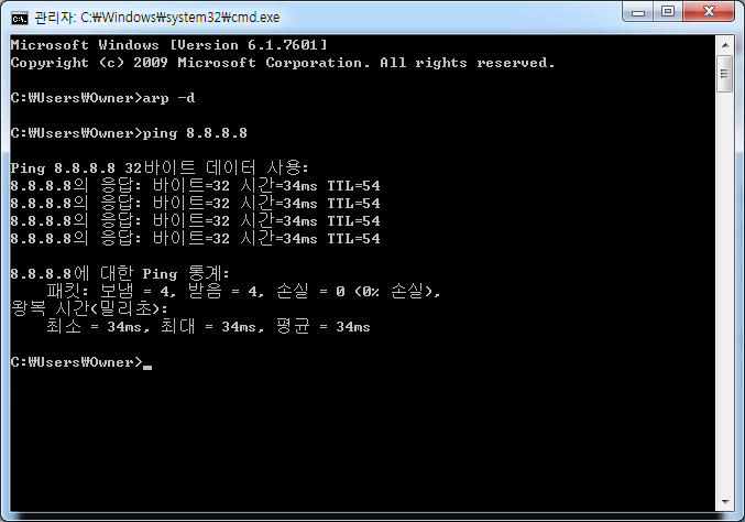 먼저 커맨드창을 켜서 arp -d 라고 입력후 ping 8.8.8.8이라고 입력해보자. 정상적으로 입력했다면 아래와 같은 화면이 나올 것이다.