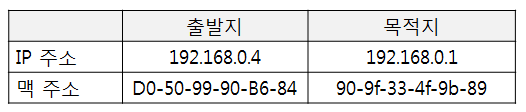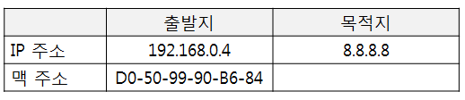 먼저 운영체제는 출발지를 필자의 컴퓨터 주소인 192.168.0.4로 설정하고 목적지 IP를 8.8.8.8로 설정할 것이다.