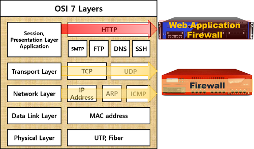 웹방화벽 7layer의 최상단인 Application 에 위치한다고 보면 됩니다