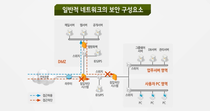 => 업무영역에 존재하는 주요 시스템에 대한 접근은 라우터, 방화벽, IDS/IPS 등을 이용하여 지정된 시스템 및 사용자만 가능하도록 제어해준다.